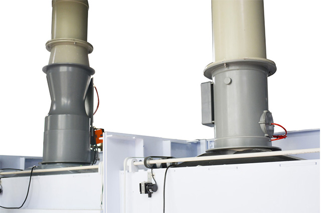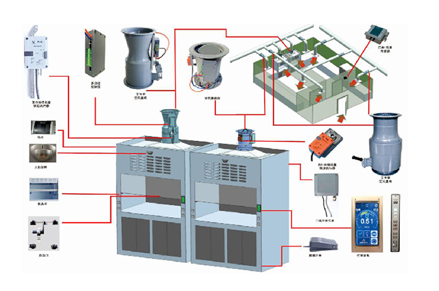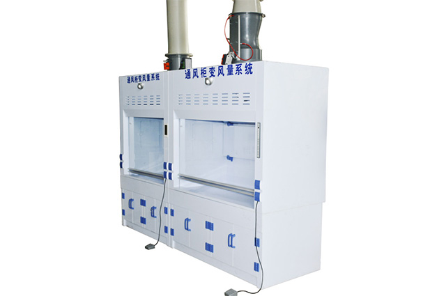 通風柜變風量系統配件:變頻控制系統,包括變頻器、靜壓傳感控制系統,控制面板三部分組成。系統安裝壓力傳感器,當通風柜排風量增大,管道壓力差減少,此時變頻器根據壓差傳感器來控制信號,通過內部程序,改變輸出頻率,是頻率增大,從而電機轉速升高,管道壓差上升到設定點。采用定靜壓控制方法,在風機排風主管道上設置管道靜壓傳感器,通過控制器和變頻器調節風機轉速,維持管道靜壓,從而達到滿足實際需要風量的目的。例如:當通風柜的視窗拉高,此時排風機管道內靜壓減小,管道靜壓傳感器感覺到壓力變化,通過控制器和變頻器調節風機,增大風機轉速,增大排風量,使管道內的靜壓值回歸到初始狀態的設定值。